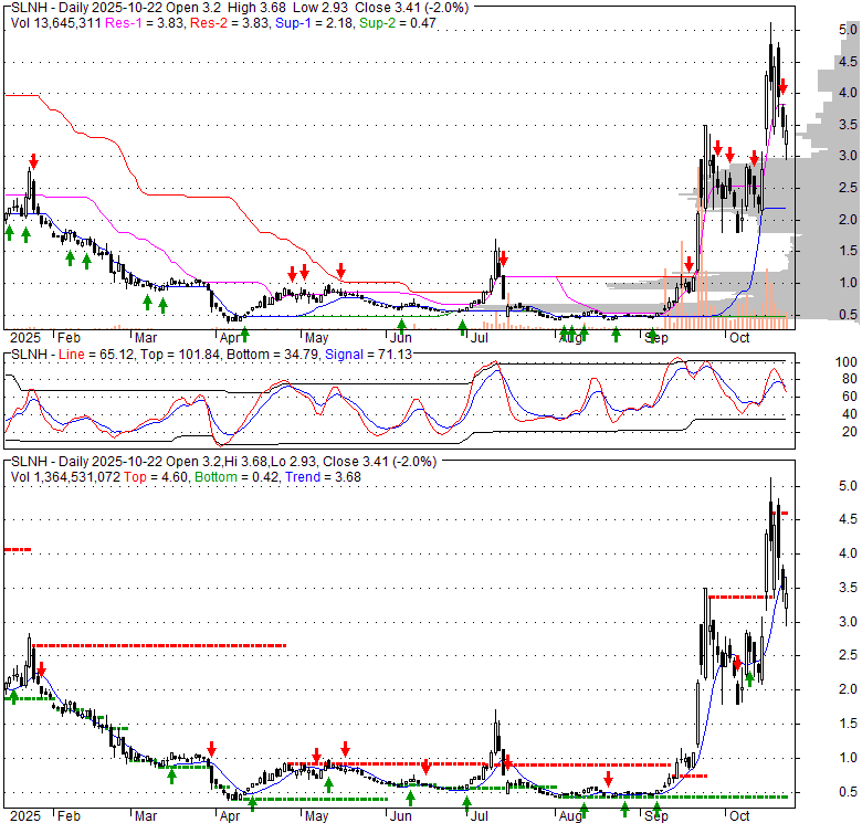 Price has closed below its short-term moving average. Short-term moving average is currently above mid-term; and above long-term moving average. From the relationship between price and moving averages: This stock is NEUTRAL in short-term; and BULLISH in mid-long term.[ SLNH ] has closed below upper band by 39.2%. Bollinger Bands are 232.7% wider than normal. The large width of the bands suggest high volatility as compared to its normal range. The bands have been in this wide range for 27 days. This is a sign that the current trend might continue.