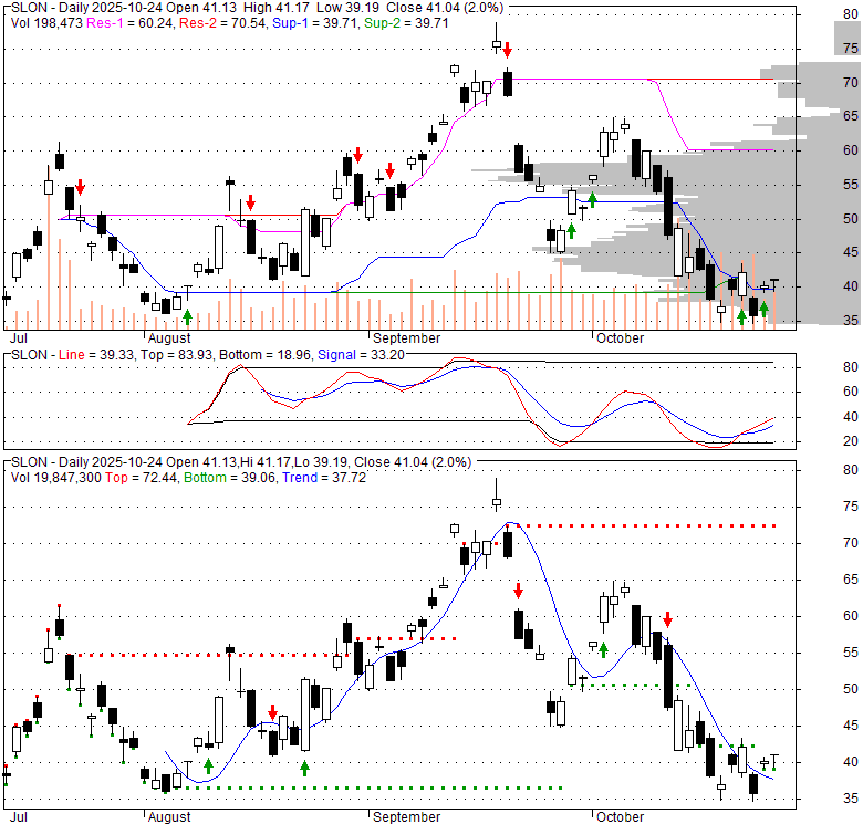 Price has closed above its short-term moving average. Short-term moving average is currently below mid-term; and below long-term moving average. From the relationship between price and moving averages: This stock is NEUTRAL in short-term; and NEUTRAL in mid-long term.[ SLON ] has closed above bottom band by 33.2%. Bollinger Bands are 0% narrower than normal.