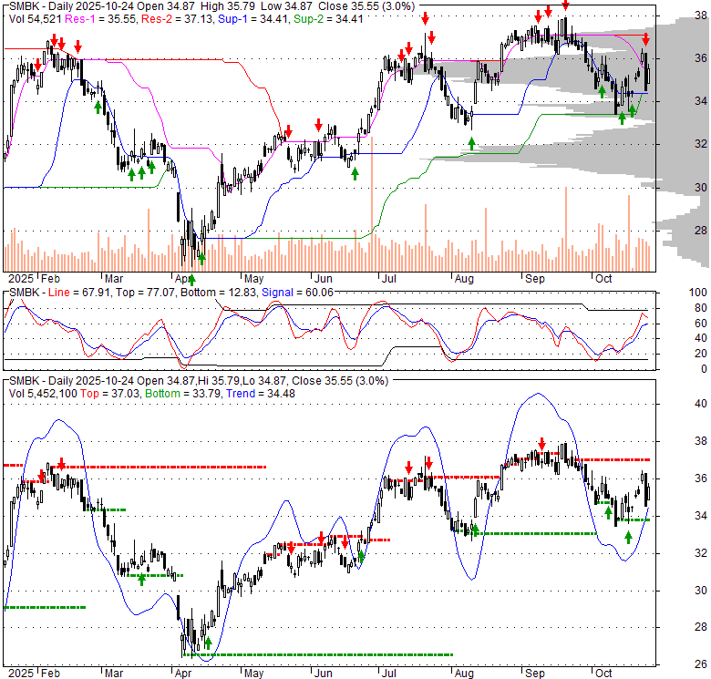 Price has closed above its short-term moving average. Short-term moving average is currently below mid-term; and above long-term moving average. From the relationship between price and moving averages: This stock is NEUTRAL in short-term; and NEUTRAL in mid-long term.[ SMBK ] has closed below upper band by 30.5%. Bollinger Bands are 9.6% narrower than normal. The current width of the bands does not suggest anything about the future direction or movement of prices.