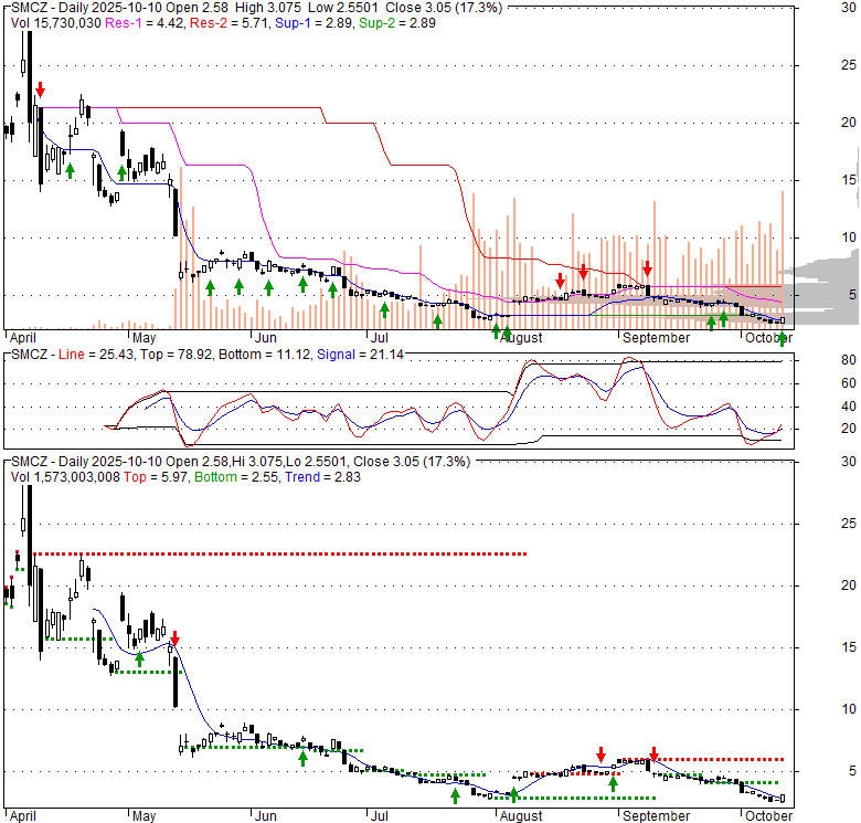 Price has closed above its short-term moving average. Short-term moving average is currently below mid-term; and below long-term moving average. From the relationship between price and moving averages: This stock is NEUTRAL in short-term; and BEARISH in mid-long term.[ SMCZ ] has closed above bottom band by 30.2%. Bollinger Bands are 21.2% narrower than normal. The current width of the bands does not suggest anything about the future direction or movement of prices.