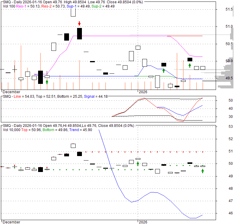 Price has closed above its short-term moving average. Short-term moving average is currently below mid-term; and below long-term moving average. From the relationship between price and moving averages: This stock is NEUTRAL in short-term; and NEUTRAL in mid-long term.[ SMQ ] has closed below upper band by 45.9%. Bollinger Bands are 0% narrower than normal.