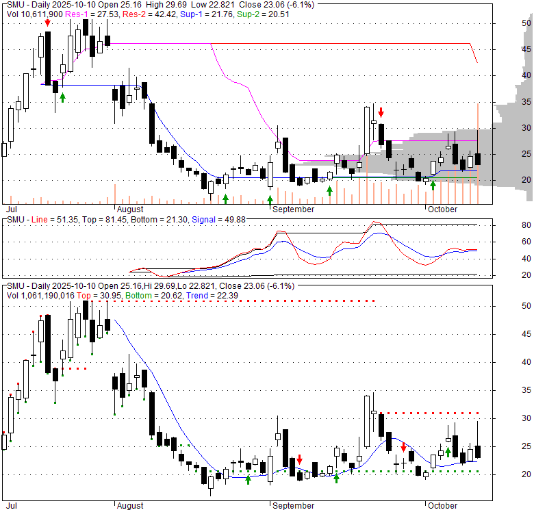 Price has closed below its short-term moving average. Short-term moving average is currently above mid-term; and below long-term moving average. From the relationship between price and moving averages: This stock is NEUTRAL in short-term; and NEUTRAL in mid-long term.[ SMU ] has closed above bottom band by 43.6%. Bollinger Bands are 0% narrower than normal.