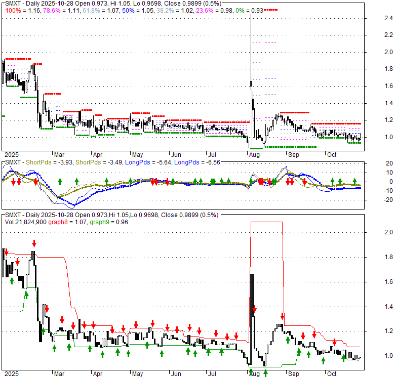 Price has closed above its short-term moving average. Short-term moving average is currently below mid-term; and below long-term moving average. From the relationship between price and moving averages: This stock is NEUTRAL in short-term; and BEARISH in mid-long term.[ SMXT ] has closed below upper band by 27.0%. Bollinger Bands are 52.1% narrower than normal. The narrow width of the bands suggests low volatility as compared to its normal range. The bands have been in this narrow range for 25 bars. This is a sign that the market may be about to initiate a new trend.