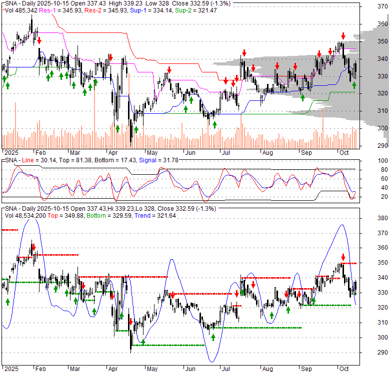 Price has closed below its short-term moving average. Short-term moving average is currently below mid-term; and above long-term moving average. From the relationship between price and moving averages: This stock is BEARISH in short-term; and NEUTRAL in mid-long term.[ SNA ] has closed above bottom band by 19.6%. Bollinger Bands are 26.5% wider than normal. The current width of the bands does not suggest anything about the future direction or movement of prices.