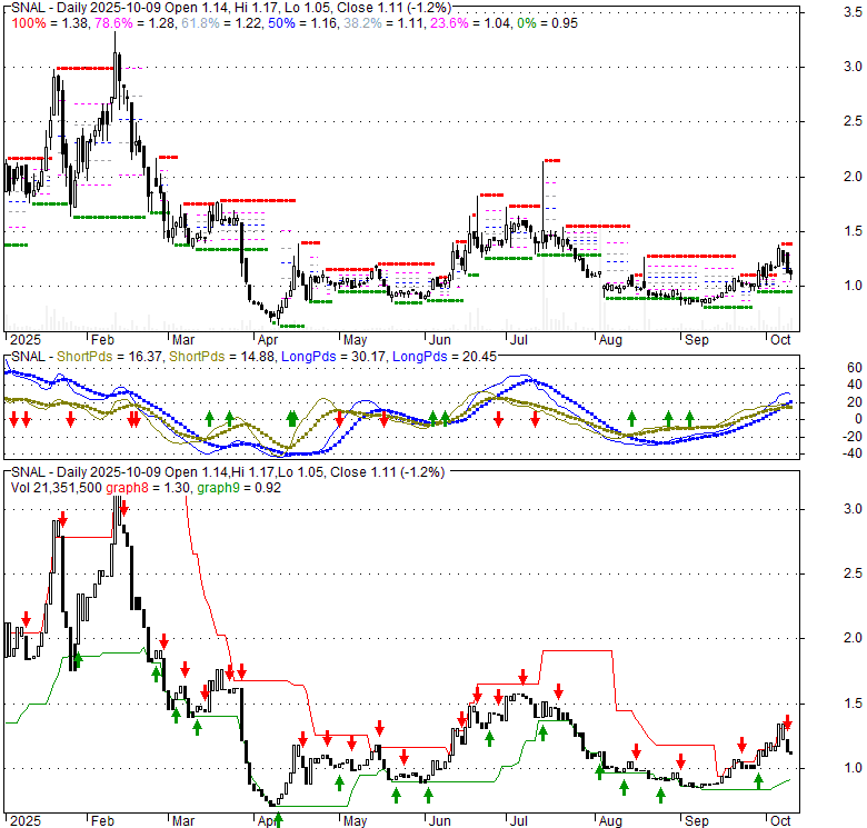 Price has closed below its short-term moving average. Short-term moving average is currently above mid-term; and above long-term moving average. From the relationship between price and moving averages: This stock is NEUTRAL in short-term; and NEUTRAL in mid-long term.[ SNAL ] has closed above bottom band by 36.6%. Bollinger Bands are 6.9% wider than normal. The current width of the bands does not suggest anything about the future direction or movement of prices.