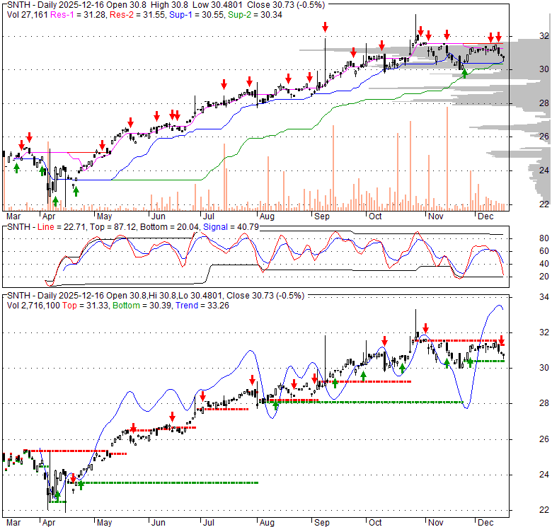 Price has closed below its short-term moving average. Short-term moving average is currently above mid-term; and above long-term moving average. From the relationship between price and moving averages: This stock is NEUTRAL in short-term; and BULLISH in mid-long term.[ SNTH ] has closed below the lower bollinger band by 1.1%. If price is in a downtrend band; this downward trend might continue. However a short term pullback inside the band is likely. Bollinger Bands are 40.6% narrower than normal. The narrow width of the bands suggests low volatility as compared to its normal range. The bands have been in this narrow range for 0 bars. This is a sign that the market may be about to initiate a new trend.