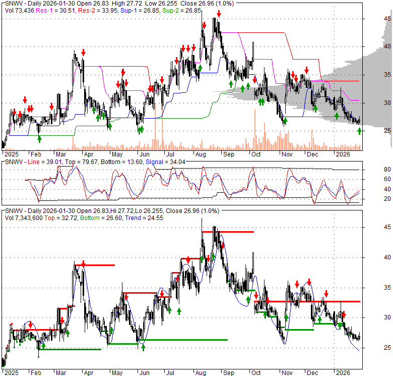 Price has closed above its short-term moving average. Short-term moving average is currently below mid-term; and below long-term moving average. From the relationship between price and moving averages: This stock is NEUTRAL in short-term; and BEARISH in mid-long term.[ SNWV ] has closed above bottom band by 35.3%. Bollinger Bands are 33.9% narrower than normal. The current width of the bands does not suggest anything about the future direction or movement of prices.