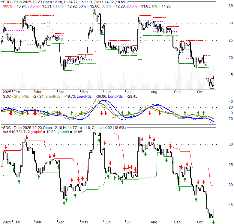 Price has closed above its short-term moving average. Short-term moving average is currently below mid-term; and below long-term moving average. From the relationship between price and moving averages: This stock is NEUTRAL in short-term; and BEARISH in mid-long term.[ SOC ] has closed above bottom band by 35.3%. Bollinger Bands are 61.6% wider than normal. The large width of the bands suggest high volatility as compared to its normal range. The bands have been in this wide range for 3 days. This is a sign that the current trend might continue.