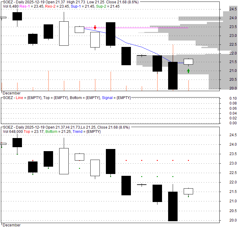 Price has closed above its short-term moving average. Short-term moving average is currently below mid-term; and below long-term moving average. From the relationship between price and moving averages: This stock is NEUTRAL in short-term; and NEUTRAL in mid-long term.[ SOEZ ] has closed Bollinger Bands are 0% narrower than normal.