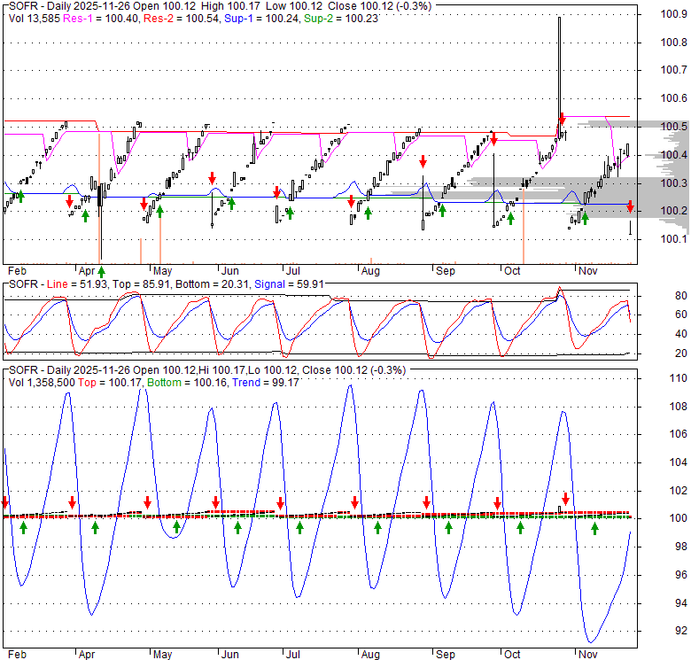 Price has closed below its short-term moving average. Short-term moving average is currently above mid-term; and above long-term moving average. From the relationship between price and moving averages: This stock is NEUTRAL in short-term; and NEUTRAL in mid-long term.[ SOFR ] has closed below the lower bollinger band by 15.5%. If price is in a downtrend band; this downward trend might continue. However a short term pullback inside the band is likely. Bollinger Bands are 22.9% narrower than normal. The current width of the bands does not suggest anything about the future direction or movement of prices.