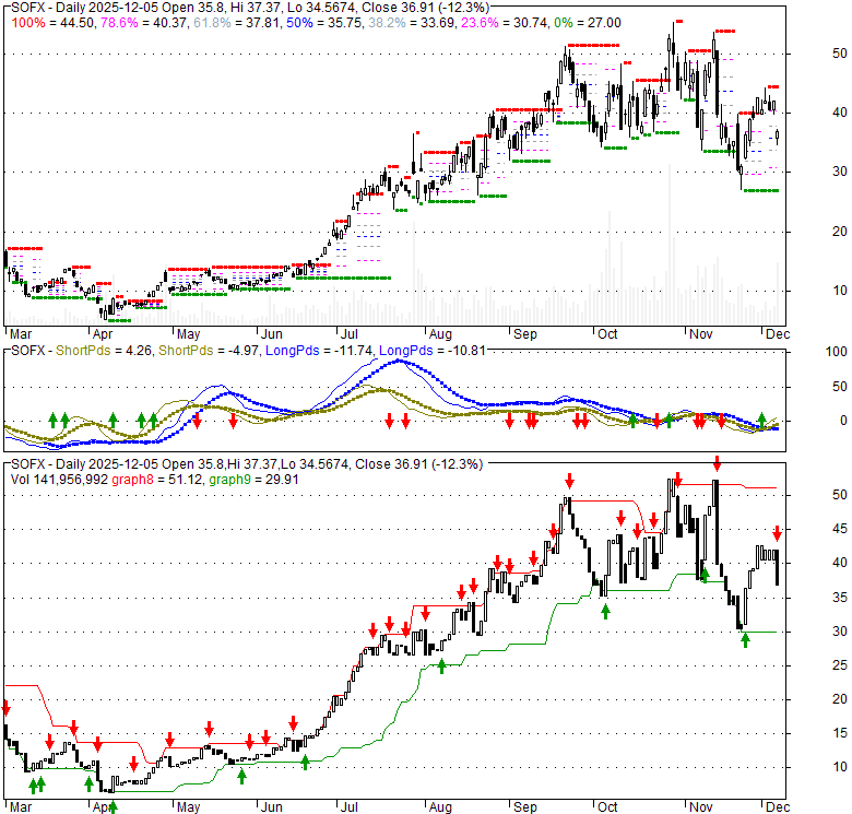 Price has closed below its short-term moving average. Short-term moving average is currently below mid-term; and above long-term moving average. From the relationship between price and moving averages: This stock is BEARISH in short-term; and NEUTRAL in mid-long term.[ SOFX ] has closed above bottom band by 45.2%. Bollinger Bands are 10.1% wider than normal. The current width of the bands does not suggest anything about the future direction or movement of prices.