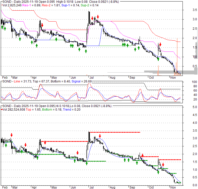 Price has closed above its short-term moving average. Short-term moving average is currently below mid-term; and below long-term moving average. From the relationship between price and moving averages: This stock is NEUTRAL in short-term; and BEARISH in mid-long term.[ SOND ] has closed above bottom band by 30.9%. Bollinger Bands are 20.1% wider than normal. The current width of the bands does not suggest anything about the future direction or movement of prices.