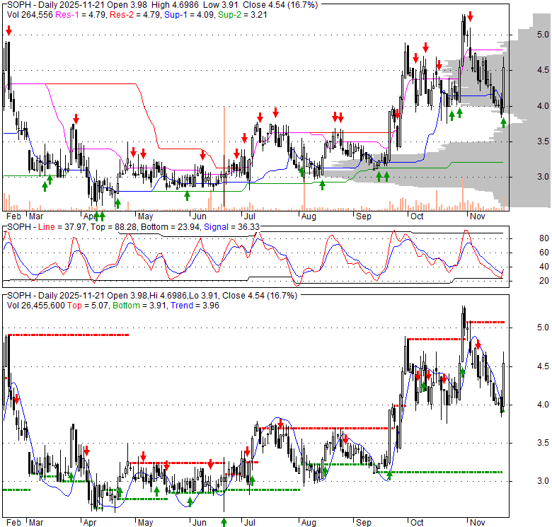 Price has closed above its short-term moving average. Short-term moving average is currently below mid-term; and above long-term moving average. From the relationship between price and moving averages: This stock is NEUTRAL in short-term; and NEUTRAL in mid-long term.[ SOPH ] has closed below upper band by 37.3%. Bollinger Bands are 25.1% wider than normal. The current width of the bands does not suggest anything about the future direction or movement of prices.