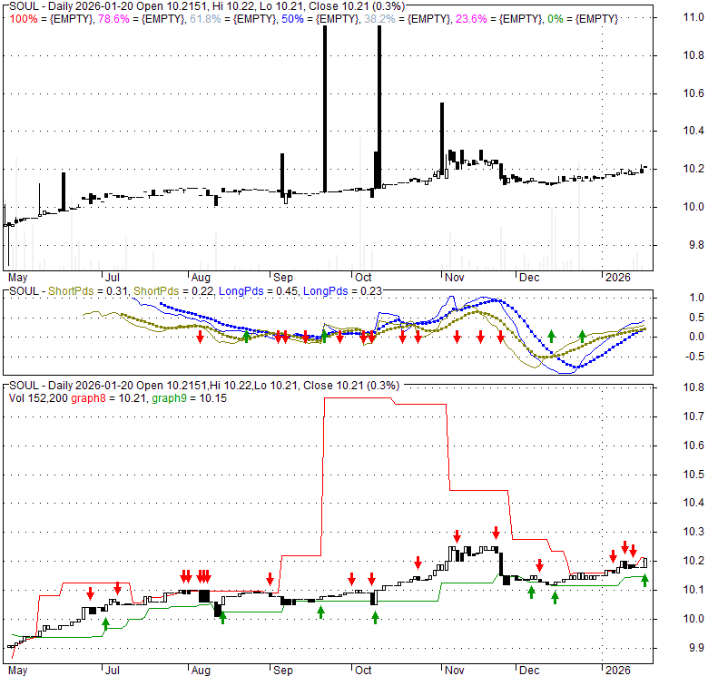 Price has closed above its short-term moving average. Short-term moving average is currently above mid-term; and above long-term moving average. From the relationship between price and moving averages: This stock is BULLISH in short-term; and BULLISH in mid-long term.[ SOUL ] has closed below upper band by 0.6%. Bollinger Bands are 7.6% narrower than normal. The current width of the bands does not suggest anything about the future direction or movement of prices.