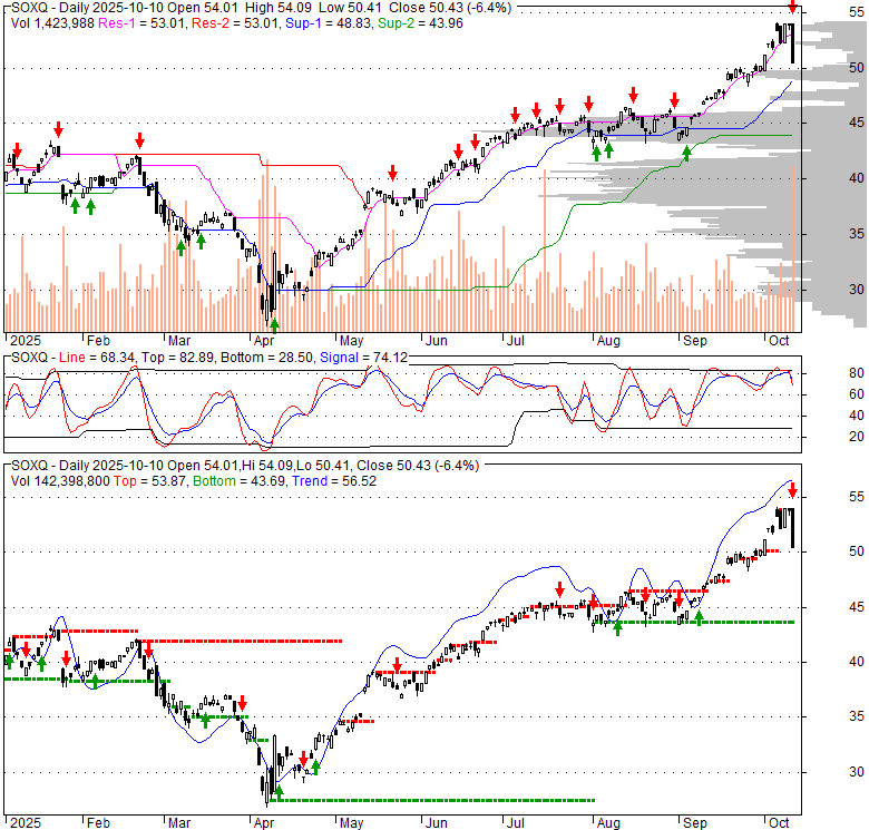 Price has closed below its short-term moving average. Short-term moving average is currently above mid-term; and above long-term moving average. From the relationship between price and moving averages: This stock is NEUTRAL in short-term; and BULLISH in mid-long term.[ SOXQ ] has closed above bottom band by 45.4%. Bollinger Bands are 54.9% wider than normal. The large width of the bands suggest high volatility as compared to its normal range. The bands have been in this wide range for 2 days. This is a sign that the current trend might continue.