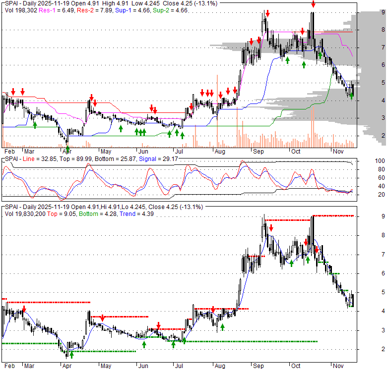 Price has closed below its short-term moving average. Short-term moving average is currently below mid-term; and below long-term moving average. From the relationship between price and moving averages: This stock is BEARISH in short-term; and NEUTRAL in mid-long term.[ SPAI ] has closed above bottom band by 11.2%. Bollinger Bands are 11.4% wider than normal. The current width of the bands does not suggest anything about the future direction or movement of prices.