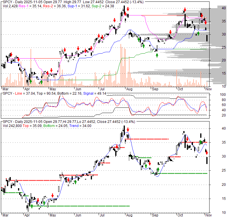 Price has closed below its short-term moving average. Short-term moving average is currently above mid-term; and above long-term moving average. From the relationship between price and moving averages: This stock is NEUTRAL in short-term; and BULLISH in mid-long term.[ SPCY ] has closed below the lower bollinger band by 8.3%. Although price has broken the lower band and a downside breakout is possible; the most likely direction for [ SPCY ] is to continue within current trading range. Bollinger Bands are 9.3% wider than normal. The current width of the bands does not suggest anything about the future direction or movement of prices.