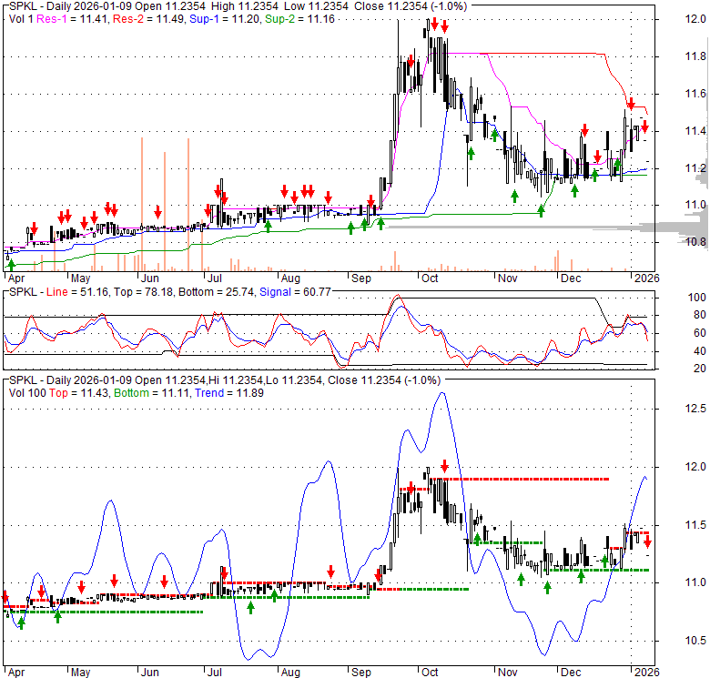 Price has closed below its short-term moving average. Short-term moving average is currently above mid-term; and above long-term moving average. From the relationship between price and moving averages: This stock is NEUTRAL in short-term; and NEUTRAL in mid-long term.[ SPKL ] has closed above bottom band by 26.0%. Bollinger Bands are 9.2% narrower than normal. The current width of the bands does not suggest anything about the future direction or movement of prices.