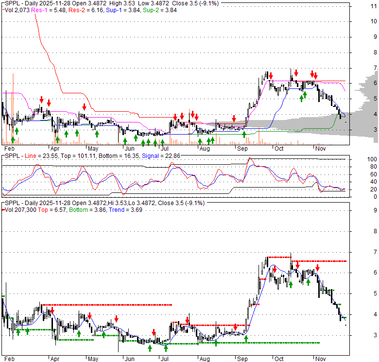Price has closed below its short-term moving average. Short-term moving average is currently below mid-term; and below long-term moving average. From the relationship between price and moving averages: This stock is BEARISH in short-term; and NEUTRAL in mid-long term.[ SPPL ] has closed above bottom band by 8.2%. Bollinger Bands are 64.1% wider than normal. The large width of the bands suggest high volatility as compared to its normal range. The bands have been in this wide range for 9 days. This is a sign that the current trend might continue.