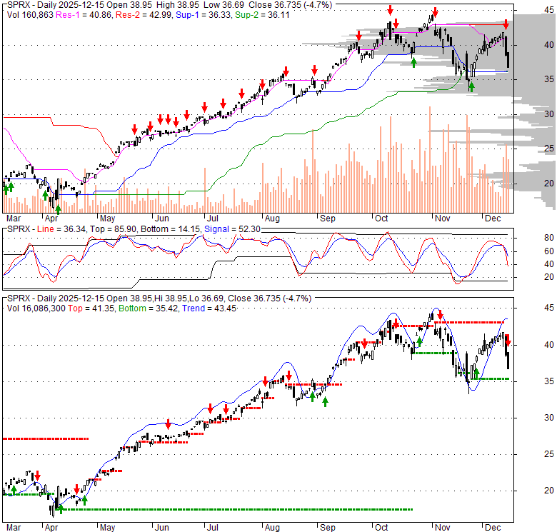 Price has closed below its short-term moving average. Short-term moving average is currently above mid-term; and above long-term moving average. From the relationship between price and moving averages: This stock is NEUTRAL in short-term; and BULLISH in mid-long term.[ SPRX ] has closed above bottom band by 11.5%. Bollinger Bands are 4.5% wider than normal. The current width of the bands does not suggest anything about the future direction or movement of prices.