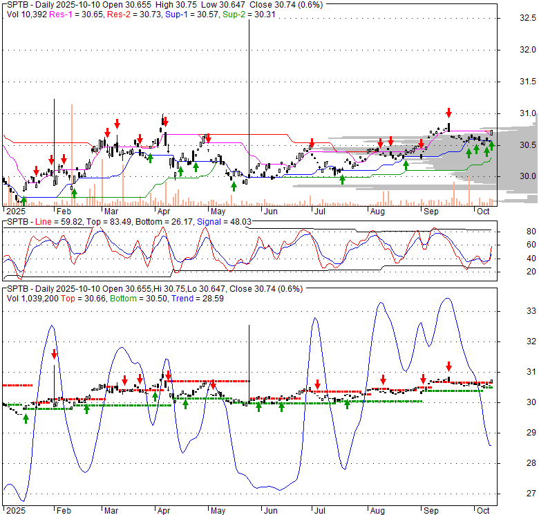 Price has closed above its short-term moving average. Short-term moving average is currently above mid-term; and above long-term moving average. From the relationship between price and moving averages: This stock is BULLISH in short-term; and BULLISH in mid-long term.[ SPTB ] has closed It is unclear right now based on current values. 48.5% narrower than normal. The narrow width of the bands suggests low volatility as compared to its normal range. The bands have been in this narrow range for 6 bars. This is a sign that the market may be about to initiate a new trend.