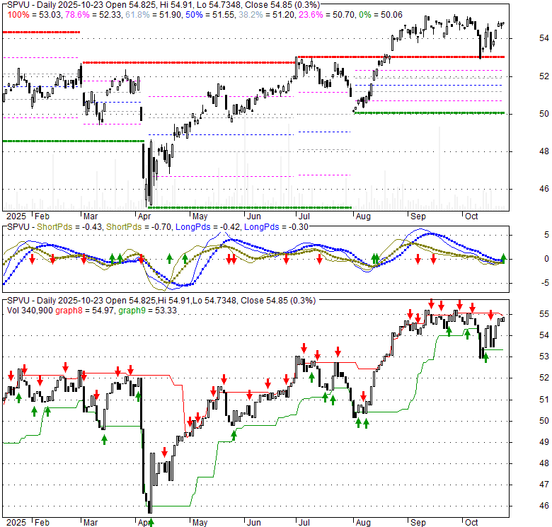 Price has closed above its short-term moving average. Short-term moving average is currently above mid-term; and above long-term moving average. From the relationship between price and moving averages: This stock is BULLISH in short-term; and BULLISH in mid-long term.[ SPVU ] has closed below upper band by 27.4%. Bollinger Bands are 7.1% wider than normal. The current width of the bands does not suggest anything about the future direction or movement of prices.