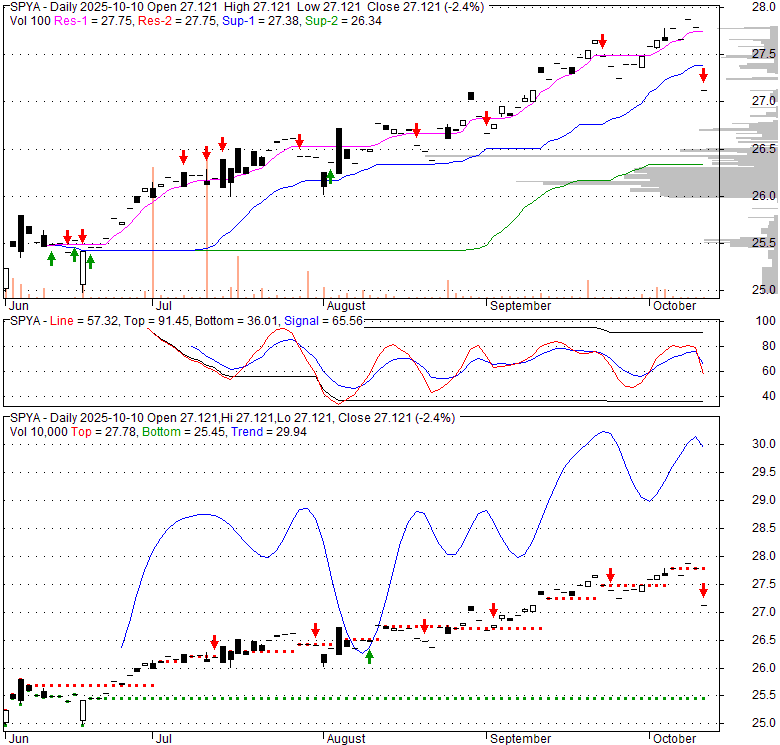 Price has closed below its short-term moving average. Short-term moving average is currently above mid-term; and below long-term moving average. From the relationship between price and moving averages: This stock is NEUTRAL in short-term; and NEUTRAL in mid-long term.[ SPYA ] has closed below the lower bollinger band by 2.0%. Although price has broken the lower band and a downside breakout is possible; the most likely direction for [ SPYA ] is to continue within current trading range. Bollinger Bands are 0% narrower than normal.