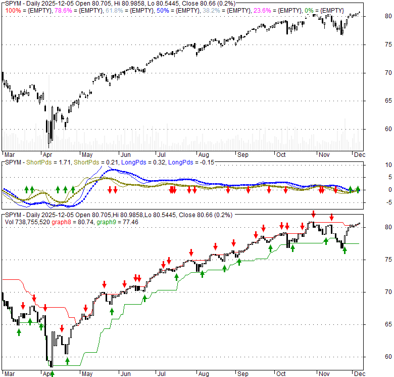 Price has closed above its short-term moving average. Short-term moving average is currently above mid-term; and above long-term moving average. From the relationship between price and moving averages: This stock is BULLISH in short-term; and BULLISH in mid-long term.[ SPYM ] has closed below upper band by 19.9%. Bollinger Bands are 79.2% wider than normal. The large width of the bands suggest high volatility as compared to its normal range. The bands have been in this wide range for 10 days. This is a sign that the current trend might continue.