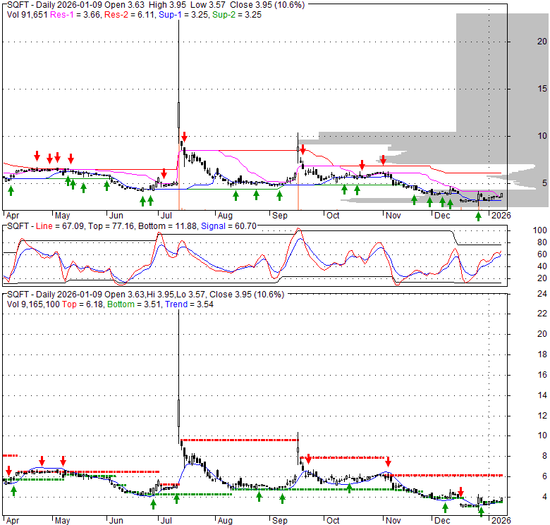 Price has closed above its short-term moving average. Short-term moving average is currently below mid-term; and below long-term moving average. From the relationship between price and moving averages: This stock is NEUTRAL in short-term; and BEARISH in mid-long term.[ SQFT ] has closed below upper band by 4.5%. Bollinger Bands are 36.4% narrower than normal. The current width of the bands does not suggest anything about the future direction or movement of prices.