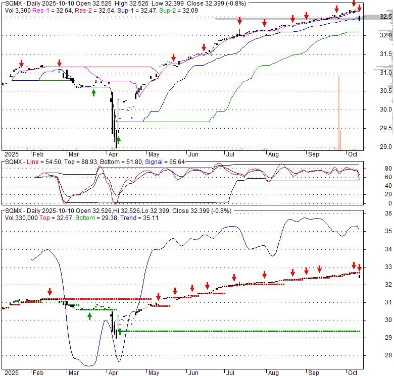 Price has closed below its short-term moving average. Short-term moving average is currently above mid-term; and above long-term moving average. From the relationship between price and moving averages: This stock is NEUTRAL in short-term; and BULLISH in mid-long term.[ SQMX ] has closed below the lower bollinger band by 3.3%. If price is in a downtrend band; this downward trend might continue. However a short term pullback inside the band is likely. Bollinger Bands are 2% narrower than normal. The current width of the bands does not suggest anything about the future direction or movement of prices.
