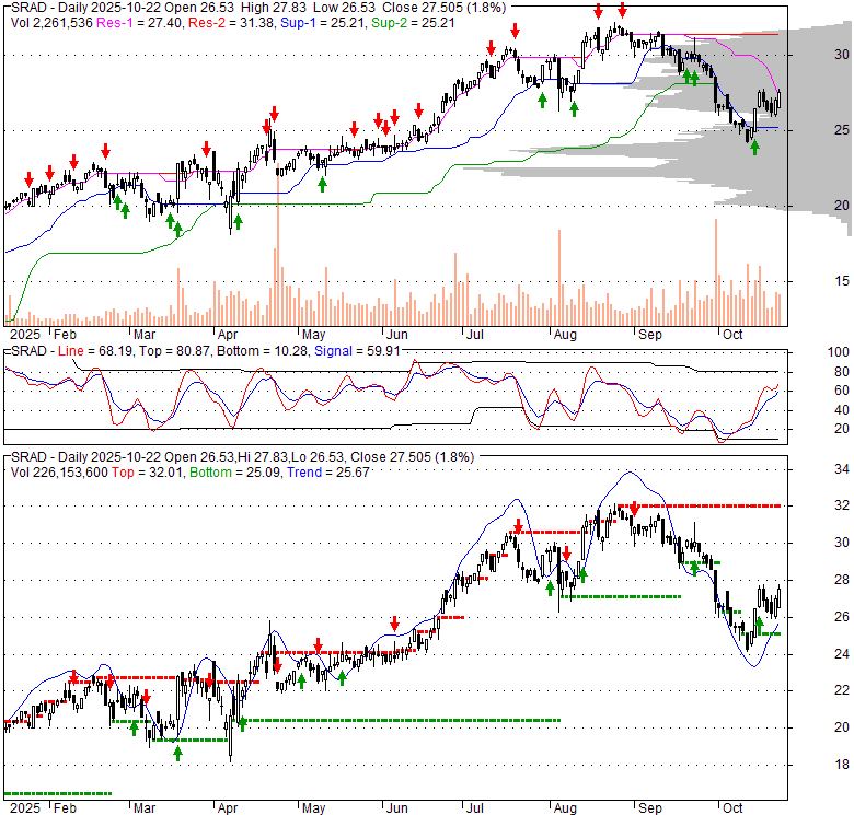 Price has closed above its short-term moving average. Short-term moving average is currently below mid-term; and below long-term moving average. From the relationship between price and moving averages: This stock is NEUTRAL in short-term; and NEUTRAL in mid-long term.[ SRAD ] has closed below upper band by 16.8%. Bollinger Bands are 6.2% wider than normal. The current width of the bands does not suggest anything about the future direction or movement of prices.