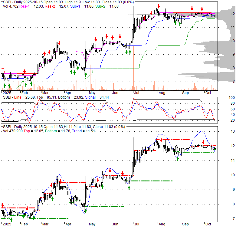 Price has closed below its short-term moving average. Short-term moving average is currently below mid-term; and above long-term moving average. From the relationship between price and moving averages: This stock is BEARISH in short-term; and NEUTRAL in mid-long term.[ SSBI ] has closed above bottom band by 24.7%. Bollinger Bands are 59% narrower than normal. The narrow width of the bands suggests low volatility as compared to its normal range. The bands have been in this narrow range for 46 bars. This is a sign that the market may be about to initiate a new trend.