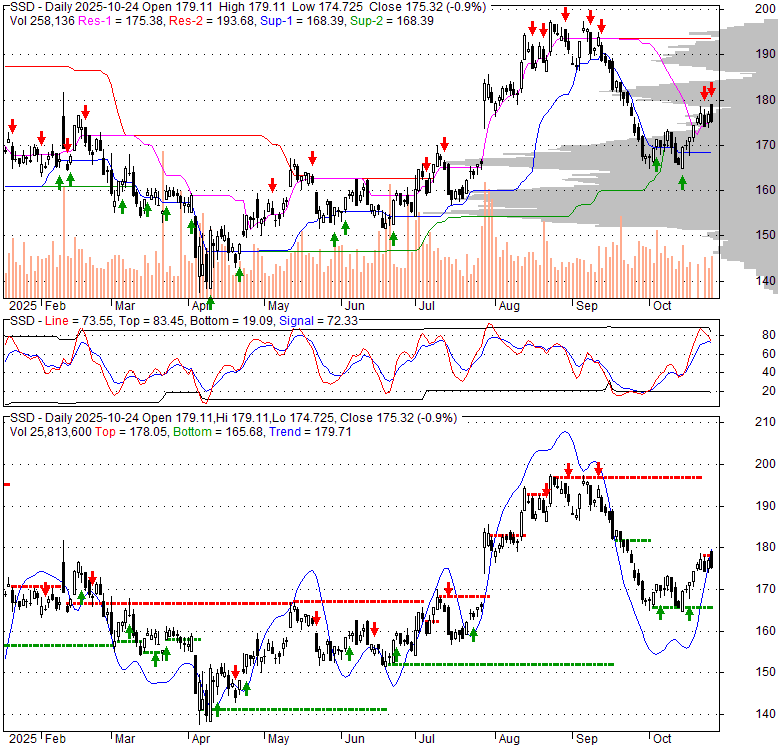 Price has closed above its short-term moving average. Short-term moving average is currently below mid-term; and above long-term moving average. From the relationship between price and moving averages: This stock is NEUTRAL in short-term; and NEUTRAL in mid-long term.[ SSD ] has closed below upper band by 17.9%. Bollinger Bands are 18.5% narrower than normal. The current width of the bands does not suggest anything about the future direction or movement of prices.