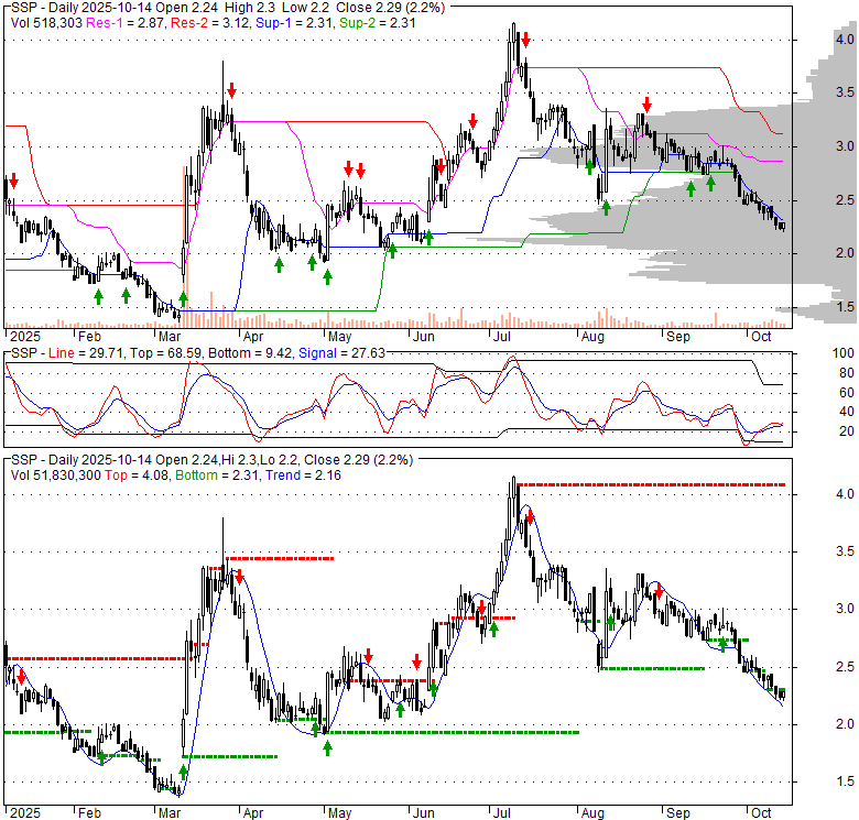 Price has closed below its short-term moving average. Short-term moving average is currently below mid-term; and below long-term moving average. From the relationship between price and moving averages: This stock is BEARISH in short-term; and BEARISH in mid-long term.[ SSP ] has closed above bottom band by 23.0%. Bollinger Bands are 21.2% narrower than normal. The current width of the bands does not suggest anything about the future direction or movement of prices.