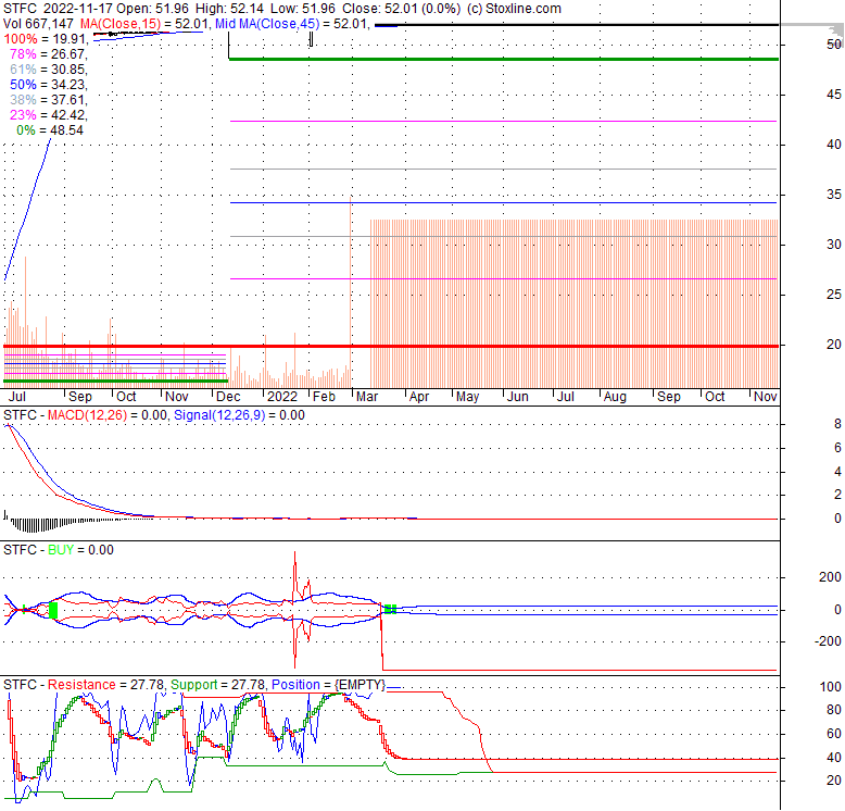 Price has closed below its short-term moving average. Short-term moving average is currently below mid-term; and below long-term moving average. From the relationship between price and moving averages: This stock is NEUTRAL in short-term; and NEUTRAL in mid-long term.[ STFC ] has closed Bollinger Bands are 0% narrower than normal.