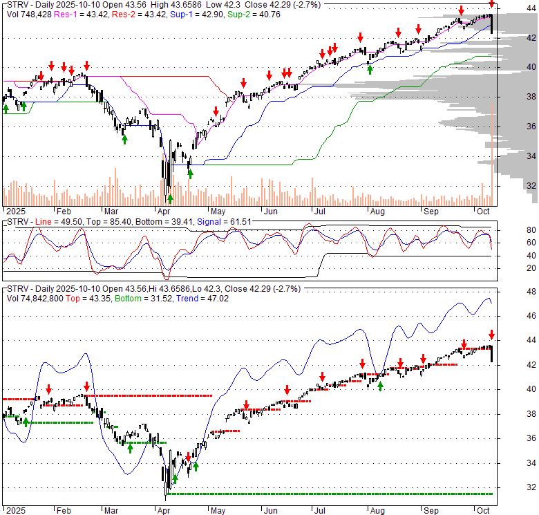 Price has closed below its short-term moving average. Short-term moving average is currently above mid-term; and above long-term moving average. From the relationship between price and moving averages: This stock is NEUTRAL in short-term; and BULLISH in mid-long term.[ STRV ] has closed below the lower bollinger band by 8.2%. Although price has broken the lower band and a downside breakout is possible; the most likely direction for [ STRV ] is to continue within current trading range. Bollinger Bands are 20.7% narrower than normal. The current width of the bands does not suggest anything about the future direction or movement of prices.
