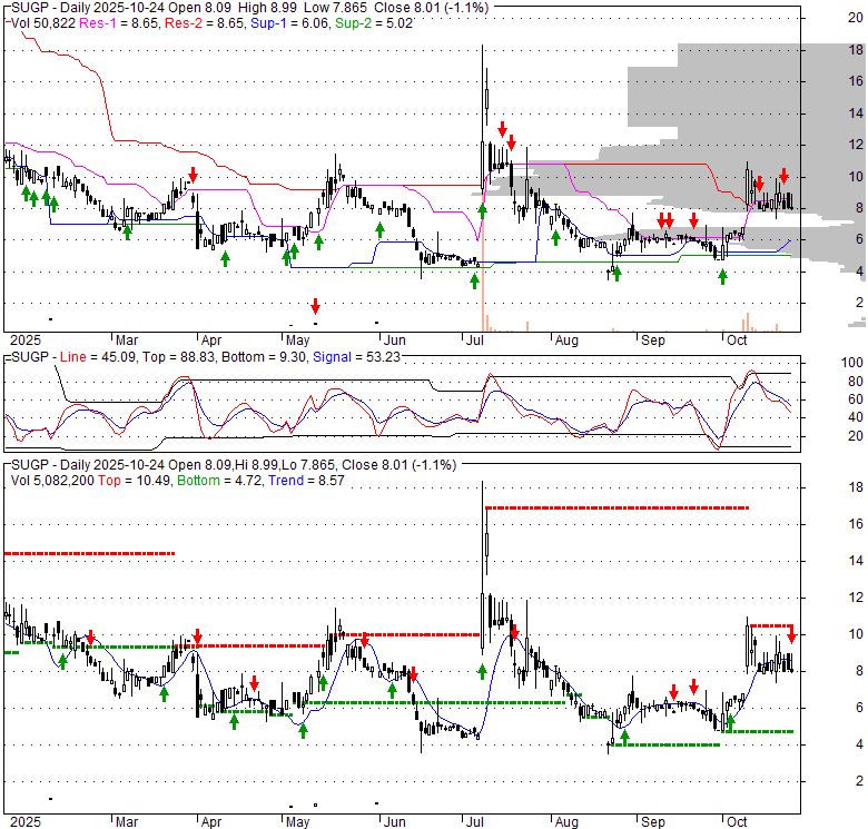 Price has closed below its short-term moving average. Short-term moving average is currently above mid-term; and above long-term moving average. From the relationship between price and moving averages: This stock is NEUTRAL in short-term; and NEUTRAL in mid-long term.[ SUGP ] has closed below upper band by 48.1%. Bollinger Bands are 19.4% narrower than normal. The current width of the bands does not suggest anything about the future direction or movement of prices.