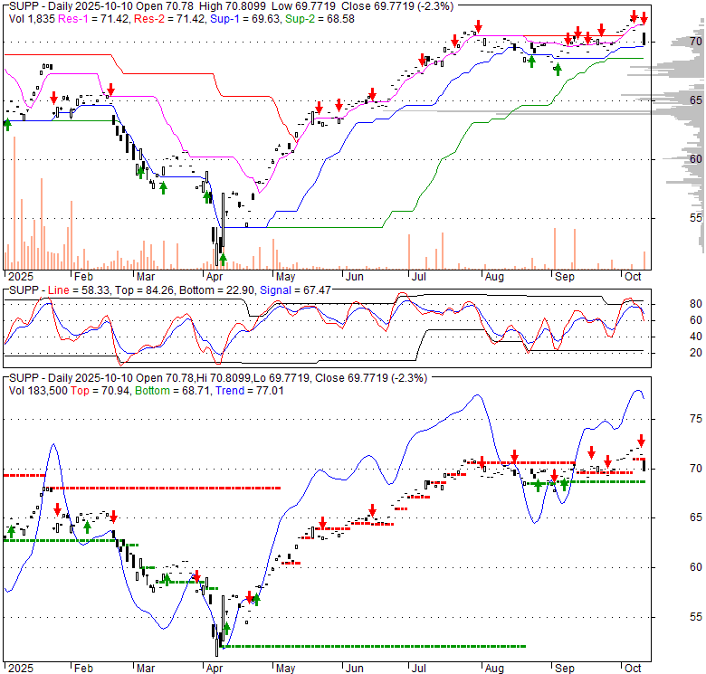 Price has closed below its short-term moving average. Short-term moving average is currently above mid-term; and above long-term moving average. From the relationship between price and moving averages: This stock is NEUTRAL in short-term; and BULLISH in mid-long term.[ SUPP ] has closed above bottom band by 38.3%. Bollinger Bands are 10.8% wider than normal. The current width of the bands does not suggest anything about the future direction or movement of prices.