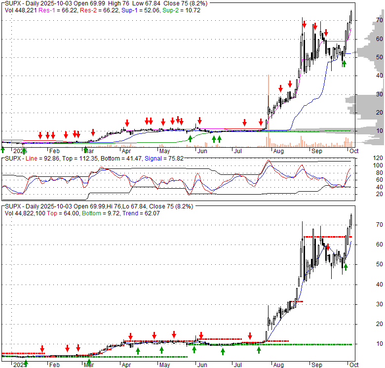 Price has closed above its short-term moving average. Short-term moving average is currently above mid-term; and above long-term moving average. From the relationship between price and moving averages: This stock is BULLISH in short-term; and BULLISH in mid-long term.[ SUPX ] has closed It is unclear right now based on current values. 121.2% wider than normal. The large width of the bands suggest high volatility as compared to its normal range. The bands have been in this wide range for 2 days. This is a sign that the current trend might continue.