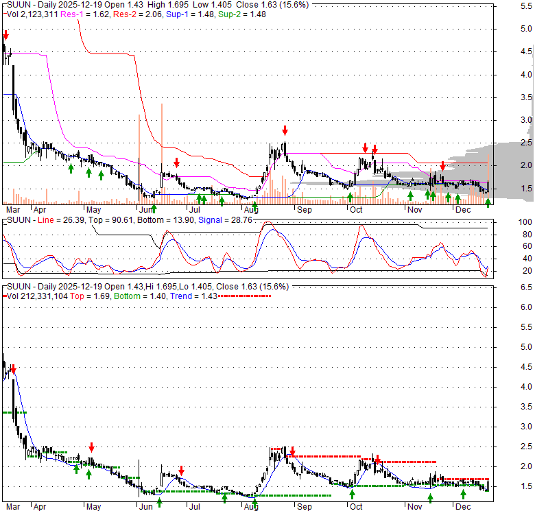 Price has closed above its short-term moving average. Short-term moving average is currently below mid-term; and below long-term moving average. From the relationship between price and moving averages: This stock is NEUTRAL in short-term; and BEARISH in mid-long term.[ SUUN ] has closed below upper band by 28.7%. Bollinger Bands are 44.9% narrower than normal. The narrow width of the bands suggests low volatility as compared to its normal range. The bands have been in this narrow range for 27 bars. This is a sign that the market may be about to initiate a new trend.