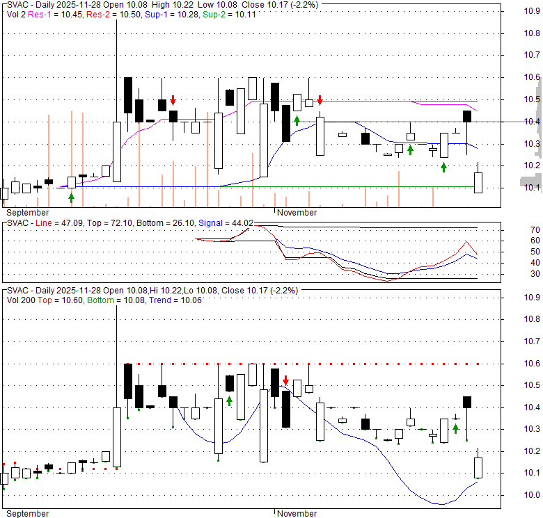 Price has closed below its short-term moving average. Short-term moving average is currently below mid-term; and below long-term moving average. From the relationship between price and moving averages: This stock is NEUTRAL in short-term; and NEUTRAL in mid-long term.[ SVAC ] has closed below the lower bollinger band by 11.7%. If price is in a downtrend band; this downward trend might continue. However a short term pullback inside the band is likely. Bollinger Bands are 0% narrower than normal.