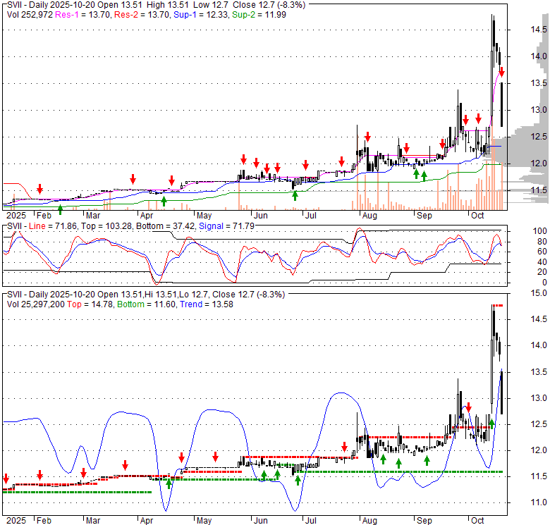 Price has closed below its short-term moving average. Short-term moving average is currently above mid-term; and above long-term moving average. From the relationship between price and moving averages: This stock is NEUTRAL in short-term; and BULLISH in mid-long term.[ SVII ] has closed above bottom band by 44.5%. Bollinger Bands are 470.3% wider than normal. The large width of the bands suggest high volatility as compared to its normal range. The bands have been in this wide range for 21 days. This is a sign that the current trend might continue.
