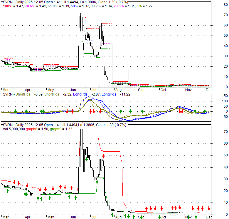 Price has closed below its short-term moving average. Short-term moving average is currently below mid-term; and below long-term moving average. From the relationship between price and moving averages: This stock is NEUTRAL in short-term; and BEARISH in mid-long term.[ SVRN ] has closed below upper band by 47.8%. Bollinger Bands are 98.3% narrower than normal. The narrow width of the bands suggests low volatility as compared to its normal range. The bands have been in this narrow range for 82 bars. This is a sign that the market may be about to initiate a new trend.