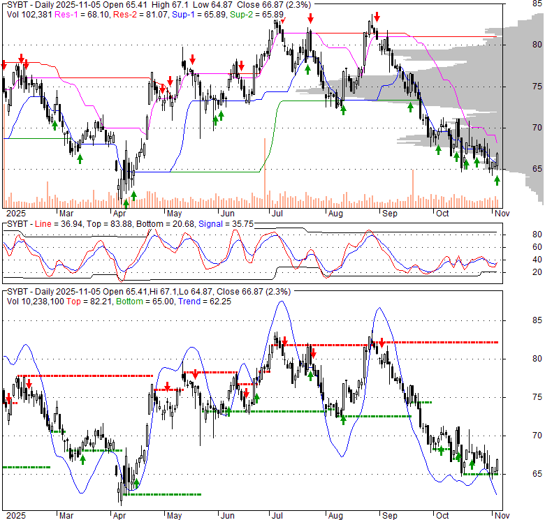 Price has closed above its short-term moving average. Short-term moving average is currently below mid-term; and below long-term moving average. From the relationship between price and moving averages: This stock is NEUTRAL in short-term; and BEARISH in mid-long term.[ SYBT ] has closed below upper band by 44.5%. Bollinger Bands are 49.1% narrower than normal. The narrow width of the bands suggests low volatility as compared to its normal range. The bands have been in this narrow range for 1 bars. This is a sign that the market may be about to initiate a new trend.