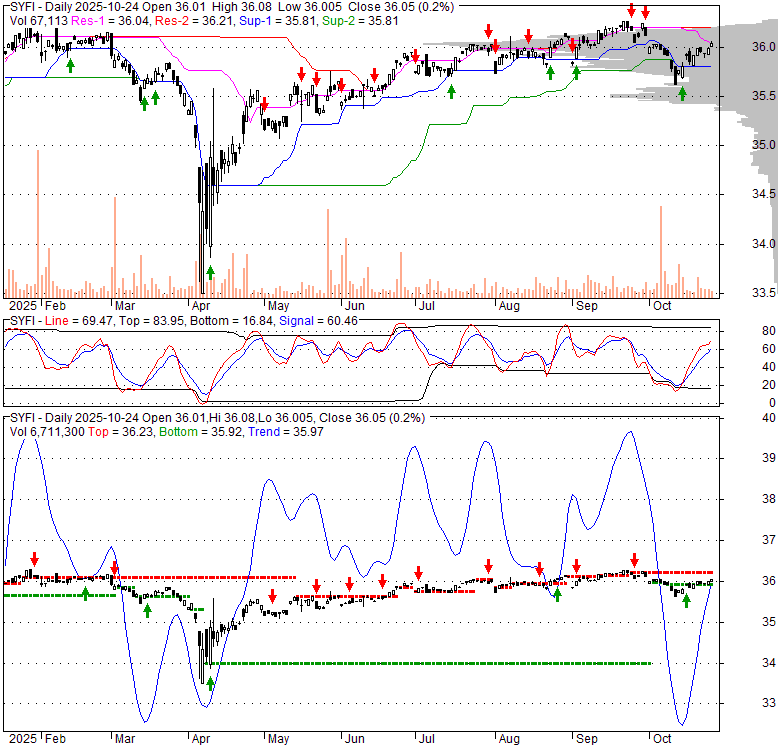 Price has closed above its short-term moving average. Short-term moving average is currently below mid-term; and above long-term moving average. From the relationship between price and moving averages: This stock is NEUTRAL in short-term; and NEUTRAL in mid-long term.[ SYFI ] has closed below upper band by 16.8%. Bollinger Bands are 11% wider than normal. The current width of the bands does not suggest anything about the future direction or movement of prices.