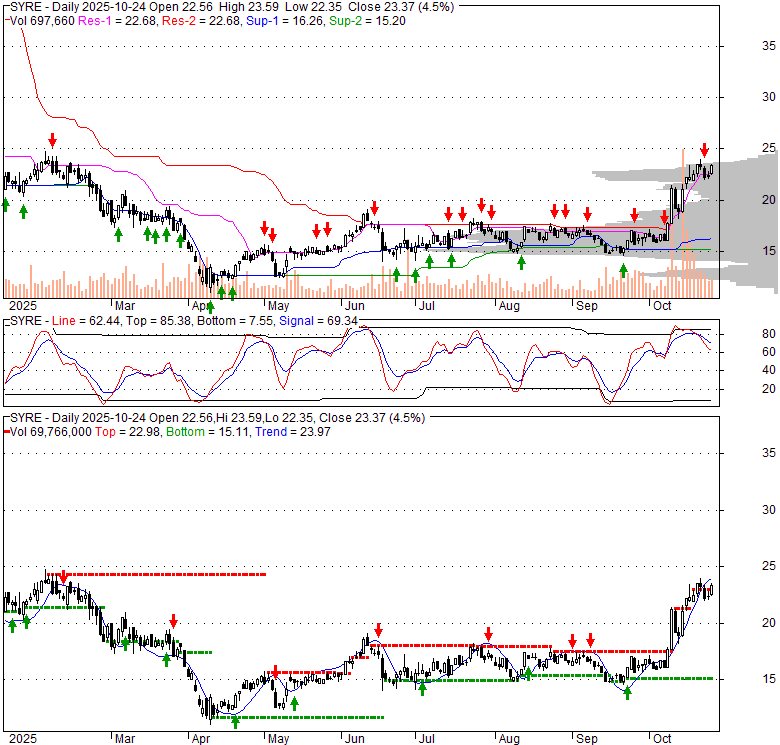 Price has closed above its short-term moving average. Short-term moving average is currently above mid-term; and above long-term moving average. From the relationship between price and moving averages: This stock is BULLISH in short-term; and BULLISH in mid-long term.[ SYRE ] has closed below upper band by 23.5%. Bollinger Bands are 167.1% wider than normal. The large width of the bands suggest high volatility as compared to its normal range. The bands have been in this wide range for 11 days. This is a sign that the current trend might continue.