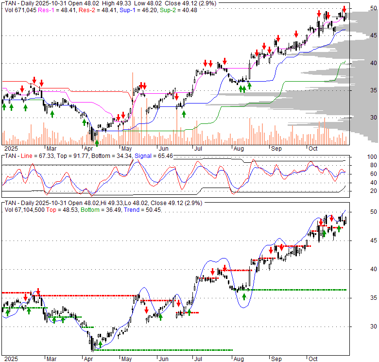 Price has closed above its short-term moving average. Short-term moving average is currently above mid-term; and above long-term moving average. From the relationship between price and moving averages: This stock is BULLISH in short-term; and BULLISH in mid-long term.[ TAN ] has closed below upper band by 13.3%. Bollinger Bands are 18.2% narrower than normal. The current width of the bands does not suggest anything about the future direction or movement of prices.