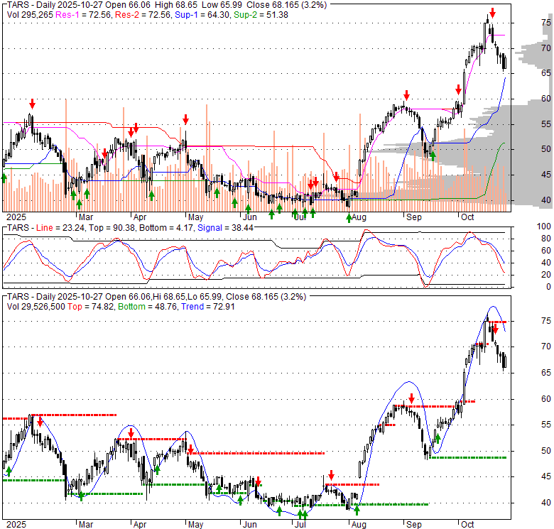Price has closed below its short-term moving average. Short-term moving average is currently above mid-term; and above long-term moving average. From the relationship between price and moving averages: This stock is NEUTRAL in short-term; and BULLISH in mid-long term.[ TARS ] has closed above bottom band by 23.1%. Bollinger Bands are 1.2% narrower than normal. The current width of the bands does not suggest anything about the future direction or movement of prices.