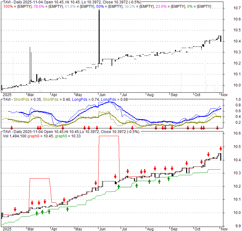 Price has closed below its short-term moving average. Short-term moving average is currently above mid-term; and above long-term moving average. From the relationship between price and moving averages: This stock is NEUTRAL in short-term; and BULLISH in mid-long term.[ TAVI ] has closed above bottom band by 22.7%. Bollinger Bands are 5.4% wider than normal. The current width of the bands does not suggest anything about the future direction or movement of prices.