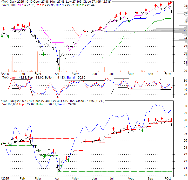 Price has closed below its short-term moving average. Short-term moving average is currently above mid-term; and above long-term moving average. From the relationship between price and moving averages: This stock is NEUTRAL in short-term; and BULLISH in mid-long term.[ TAX ] has closed below the lower bollinger band by 18.0%. If price is in a downtrend band; this downward trend might continue. However a short term pullback inside the band is likely. Bollinger Bands are 11.2% narrower than normal. The current width of the bands does not suggest anything about the future direction or movement of prices.